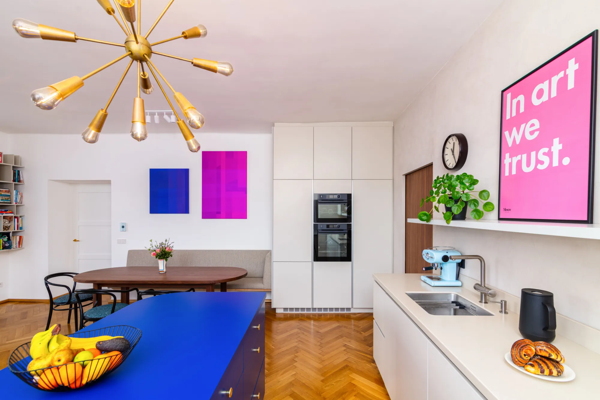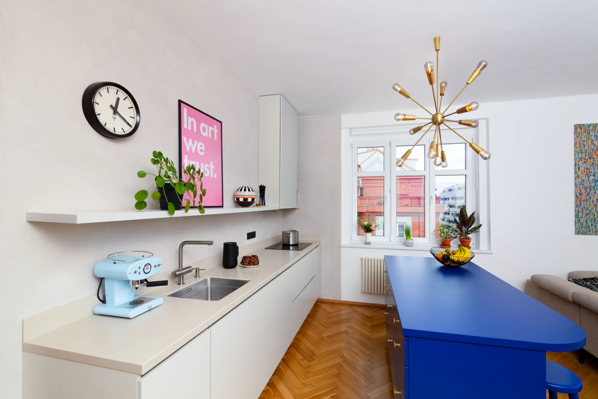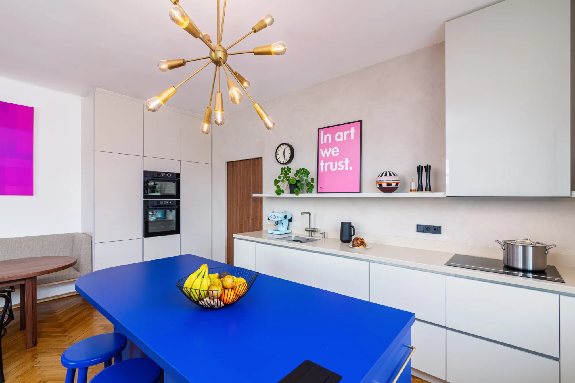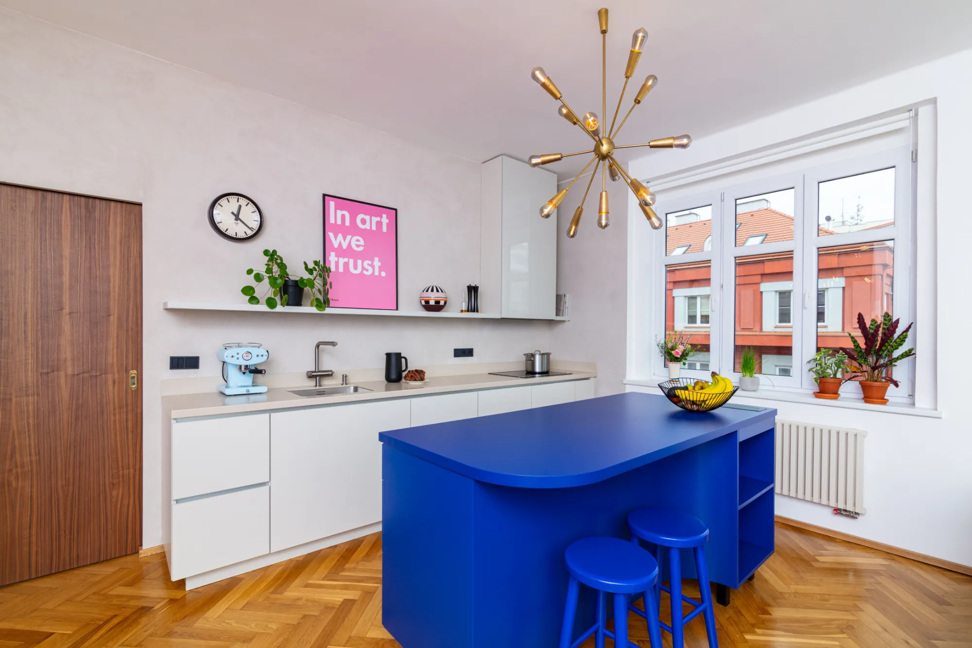 Dominantu kuchyně tvoří modrý kuchyňský ostrůvek, který dostal hned několik funkcí – kromě toho, že funguje jako hlavní prostor pro přípravu jídla, poskytuje dostatečné množství úložného prostoru, slouží také jako místo pro setkávání s přáteli.