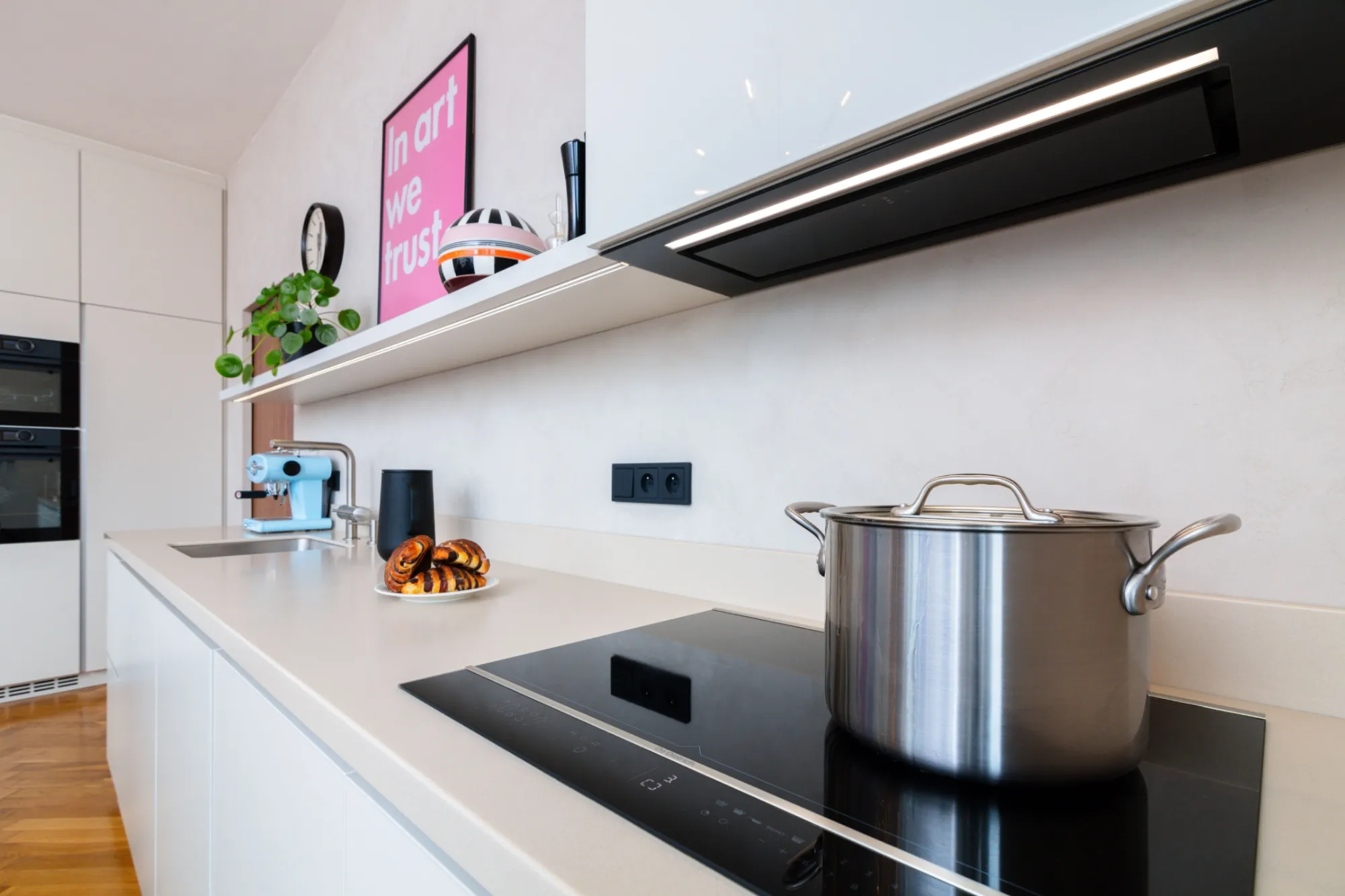 Malé nahlédnutí do kuchyně v zrekonstruovaném bytě v Holešovicích. Celý prostor skvěle kombinuje historickou atmosféru místa s moderními prvky a uměním. V kuchyni majitelé ponechali repasované parkety a spolu s elegantní tmavou dýhou, jemnými tóny béžové a divokou modří vytvořili dechberoucí a nezapomenutelný celek.